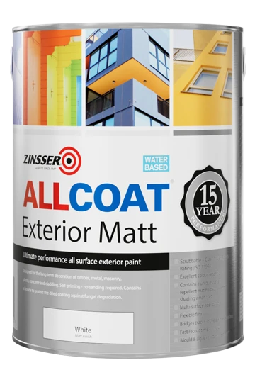 Zinsser AllCoat® Exterior Matt is an ultimate performance all surface paint. Designed for the long term decoration of timber, metal, masonry, plastic, concrete, cladding and more, it forms a vapour-permeable, low maintenance water-shedding coating, recoatable in 1 hour.