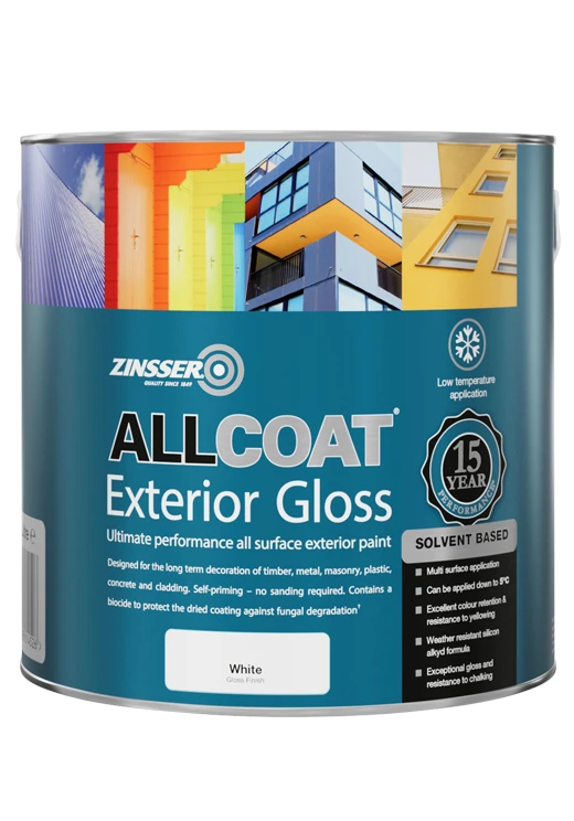 Zinsser AllCoat® Exterior Gloss (solvent-based) is an ultimate performance, mould resistant paint, that offers supreme protection for up to 15 years to all suitably primed exterior surfaces, including wood, metal, masonry, plastic, concrete and cladding.