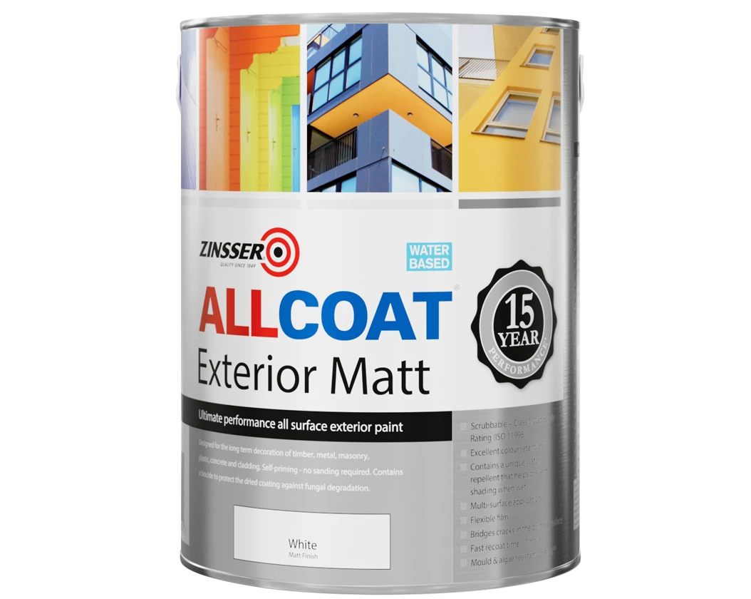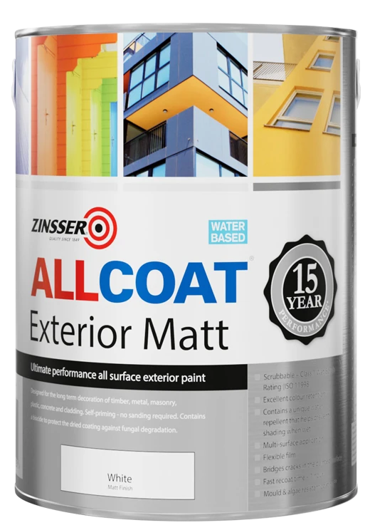 Zinsser AllCoat® Exterior Matt is an ultimate performance all surface paint. Designed for the long term decoration of timber, metal, masonry, plastic, concrete, cladding and more, it forms a vapour-permeable, low maintenance water-shedding coating, recoatable in 1 hour.