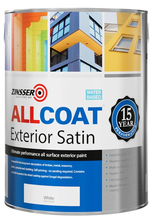 Zinsser AllCoat® Exterior is an ultimate performance, mould-resistant paint, that offers supreme protection to all exterior surfaces, including wood, metal, masonry, plastic, concrete and cladding. It forms a vapour-permeable, low maintenance, water-shedding coating that is recoatable in 1 hour.
