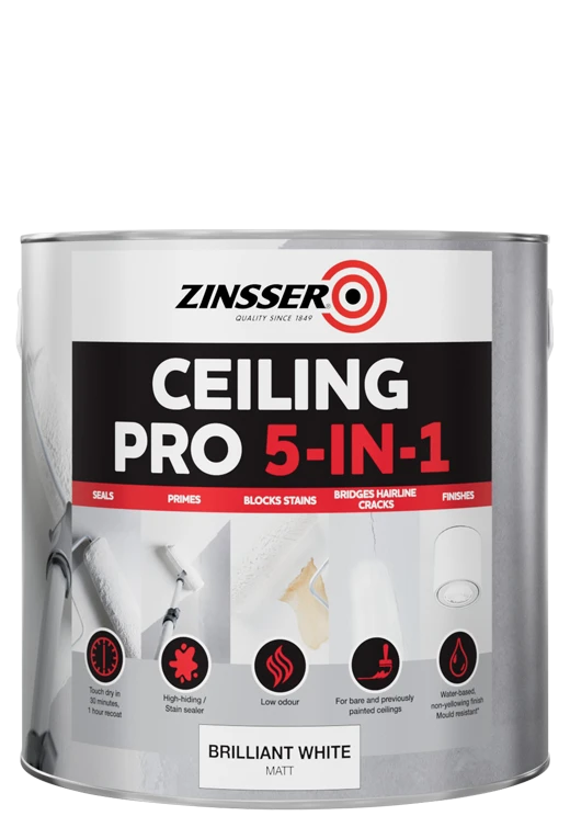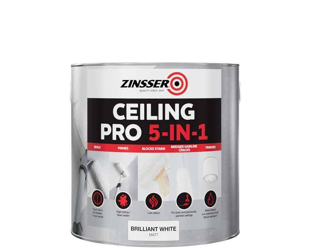Zinsser Ceiling Pro 5-in-1 is based on ground-breaking paint technology that effortlessly provides a perfectly finished ceiling every time. It adheres to any surface, seals stains (including water and smoke stains), primes and finishes whilst bridging hairline cracks.